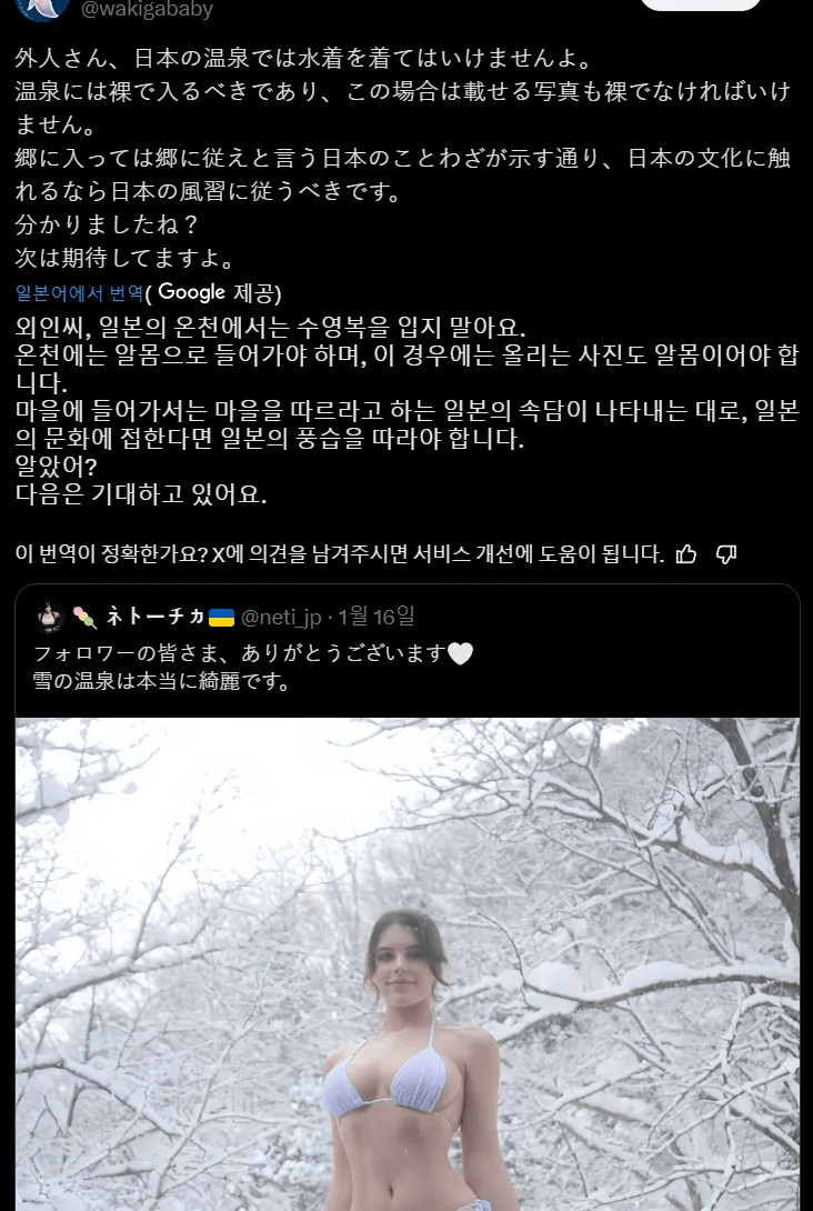 일본 전통을 무시해 화가 난 일본인 페이지 정보 작성자 안구정화 댓글 0건 조회 193회 작성일 26-03-20 16:06 목록 본문 서양인이 일본 온천에서 찍은 사진 허나 어느 일본인이 "온천에는 알몸으로 들어가는게 전통이거늘 지금 일본 무시하는거냣"라며 일?갈을 했고 이후 전통을 수용한 사진을 올렸는데 "어째서 몸을 가리는것이냐"라며 다시 일갈... 일본 전통을 무시해 화가 난 일본인 이전글젖은 수건 한장으로 가린 노브라 꼭지 26.03.20 다음글여름이 더워서 ㅈ같지만 빨리 와야하는 이유 26.03.20 댓글 0 댓글목록 등록된 댓글이 없습니다.