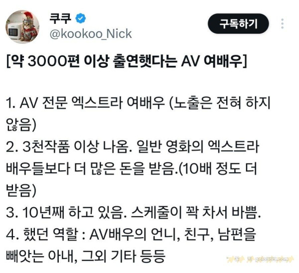 약 3000편 이상 출연했다는 AV 여배우 페이지 정보 작성자 안구정화 댓글 0건 조회 194회 작성일 26-03-21 03:58 목록 본문 약 3000편 이상 출연했다는 AV 여배우 이전글색기 GOAT 58년생 샤론 스톤 누님 근황 26.03.21 다음글7 26.03.21 댓글 0 댓글목록 등록된 댓글이 없습니다.