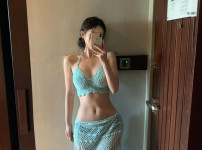민트색 니트 비키니 가슴골